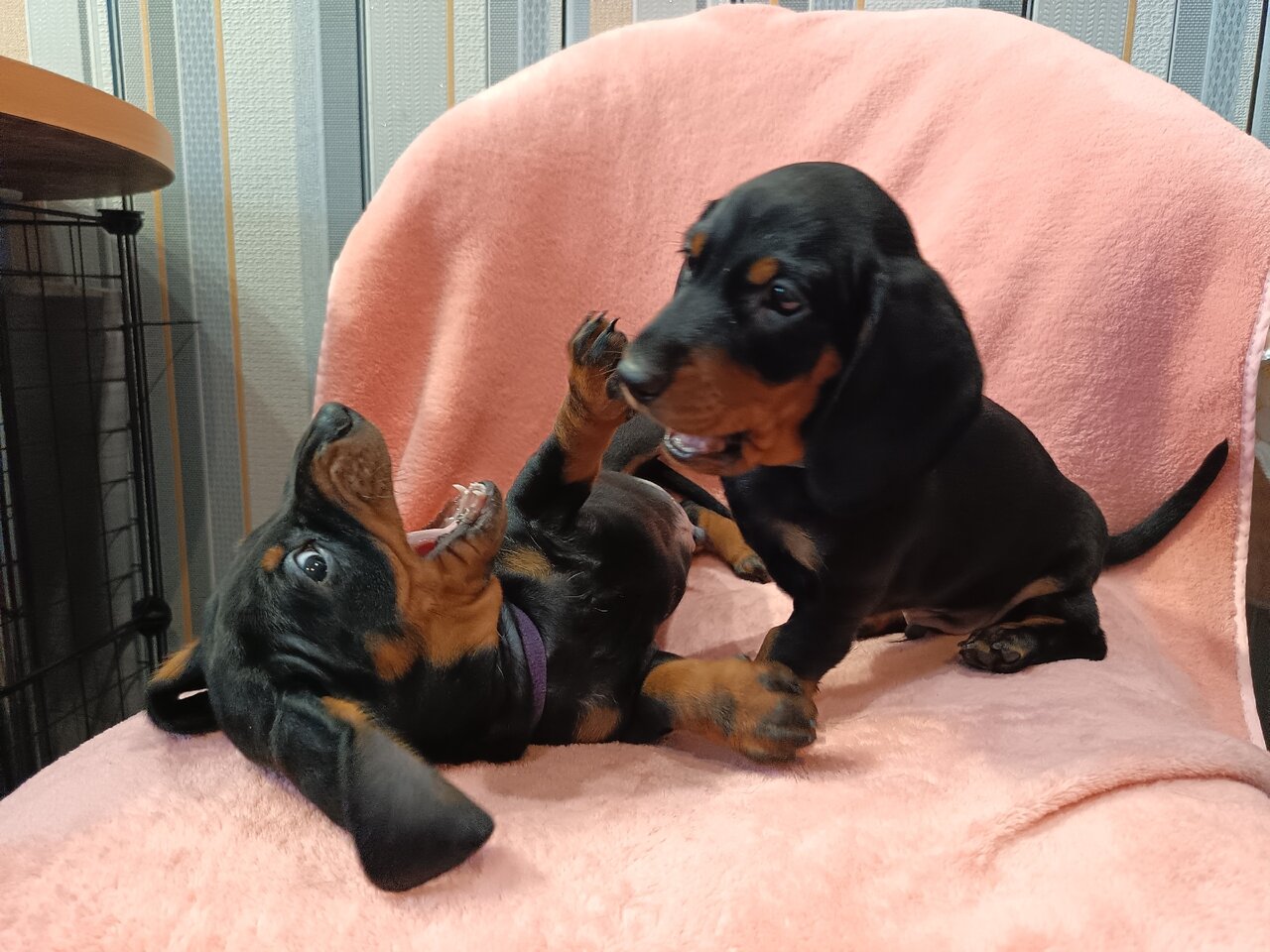 Если вы думаете, что такса — это спокойная диванная собака, значит, вы не видели их в полтора месяца. Сейчас они больше напоминают необъезженных пони: прыжки, скачки и бесконечные игры. Энергия бьет ключом!