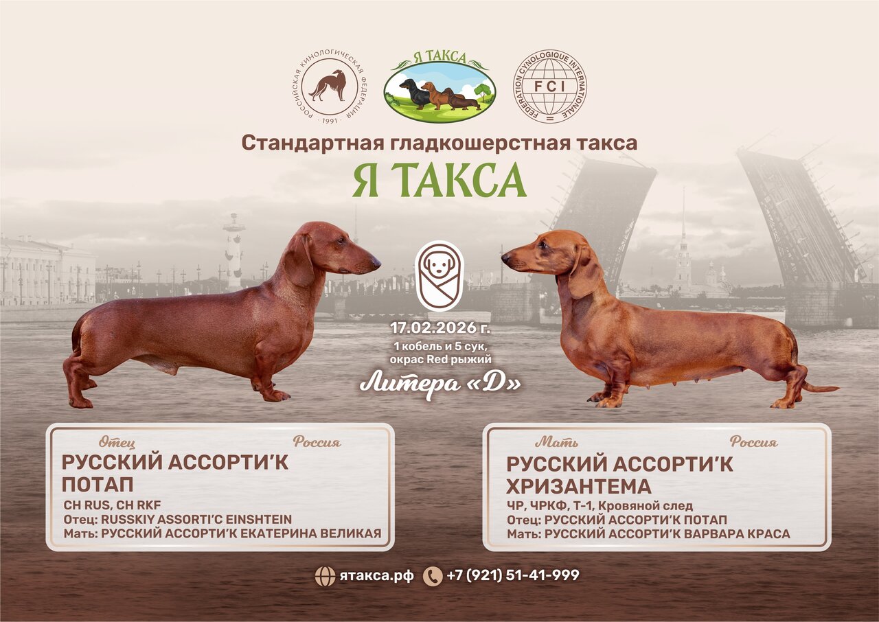 На карточке — все ключевые данные о родителях и составе помета. Это классика стандартной гладкошерстной таксы в лучшем проявлении.
